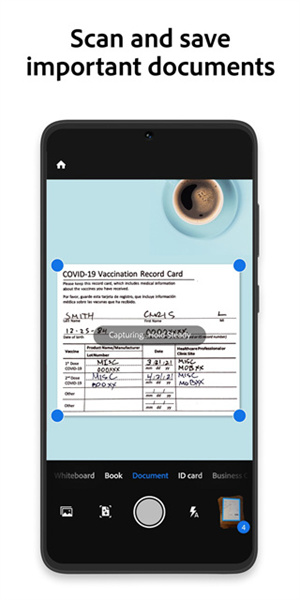 扫描任何内容:Adobe Scan 可以捕获各种文档、收据、便笺、白板、名片甚至照片。