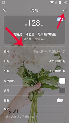 2.填写你纪念日的信息然后点击上方的√,即可完成设置。