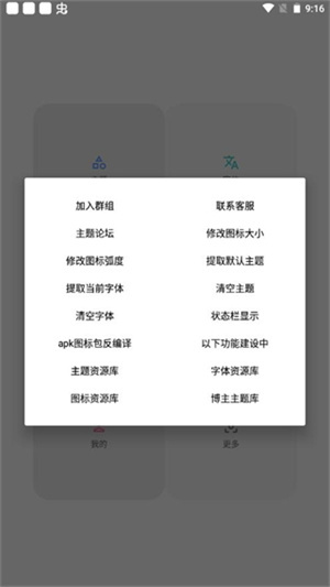 3、点击主题,选择主题资源,有修改图标弧度、秀海图标大小、提取当前字体等功能;