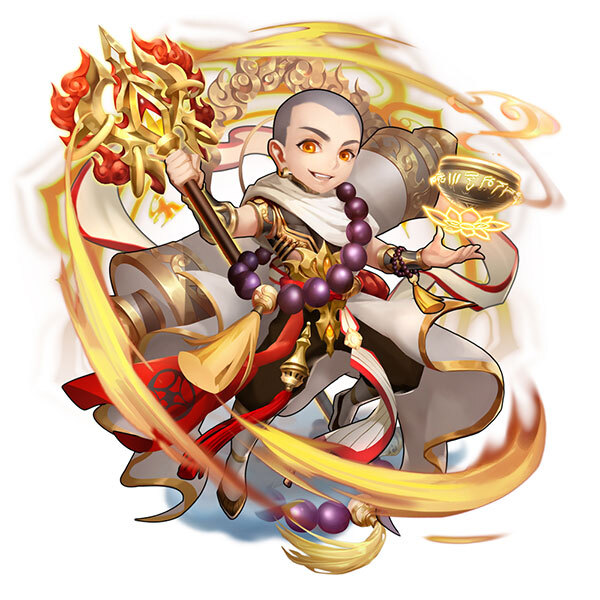 回合结束前,金蝉子对敌方攻击最高的2名神将造成大量伤害及混沌伤害,如果在“禅境”内,则额外吸收目标各1点法宝能量到自身法宝中。