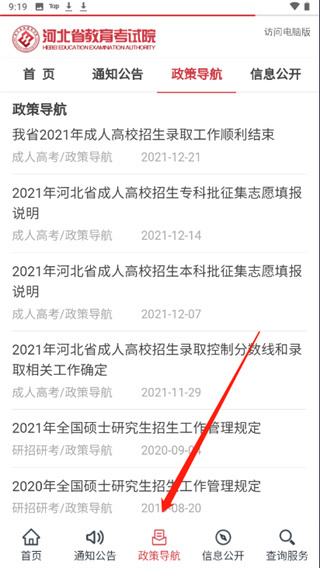 3、“政策导航”里面包含最新的成人高校招生信息。