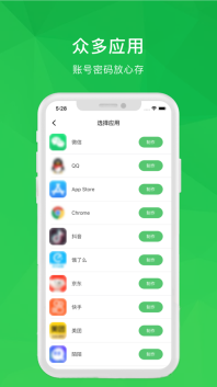 1. 可自行添加各类不同的应用标签,实现对全部密码与账号的高效管理。