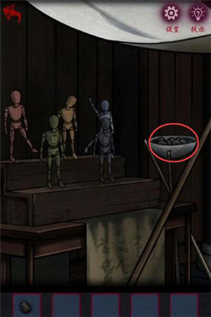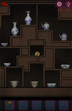 10、开启后,在桌上拿到瓷器,根据门上的画在墙上的砖块后输入密码,打开获得提示。