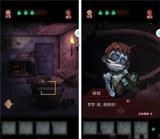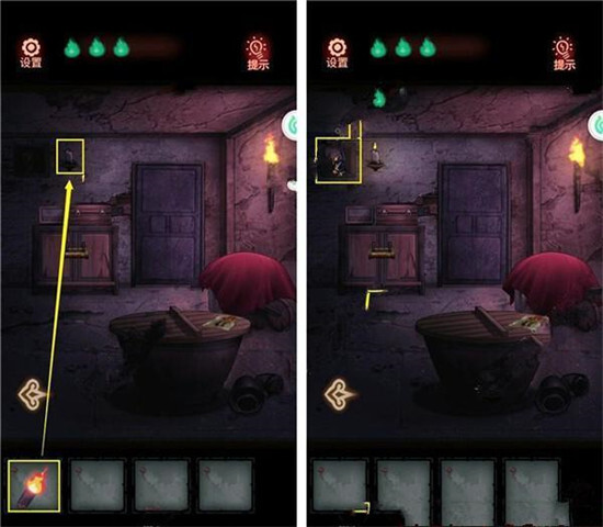 2、拿起【火把】,将墙上的蜡烛点燃,随后拾取【娃娃】。
