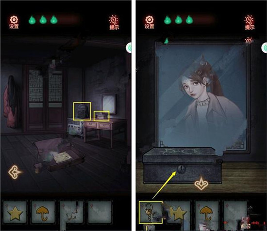 13、拾取背包上的【钥匙】,用【钥匙】打开梳妆台上的盒子,获得【心碎饰品】。