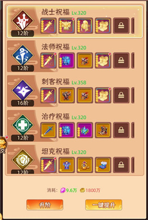 6、祝福:游戏中根据5个职业划分出5种祝福,每种祝福最高提升到10阶,祝福可以配戴4个部位的装备