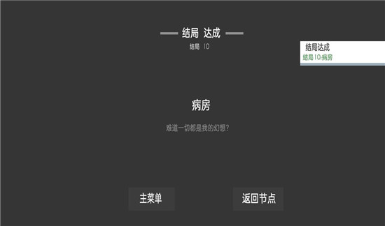 参照结局五,在第二章时,从桌子和床下找出八音盒。到第三章拨打325这个号码,而在第四章时,不要进行救火操作(因为一旦救火,再去看照片就会进入结局五),最终按照结局一的情节完整推进。(结果发现自己身处病房,也有可能这只是水箱的又一个假象)