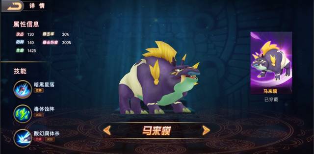 向身体四周一定范围内散射强烈的腐蚀液体,对目标造成伤害,同时降低其40%防御,配合技能二共可降低敌人60%的防御,一切敌人在马来貘面前都将如纸一般脆弱。