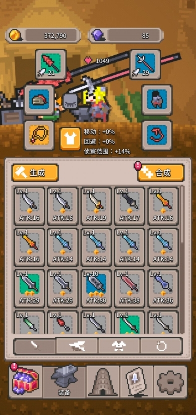 看我武器攻击力和血量便能知晓。武器选用推测范围为3的,饰品选择增加探测距离的,这便是攻击距离,所谓一寸长一寸强嘛。人物本身就自带攻击,而且在图里升级还会增加属性,因此对装备的需求大大降低。要是比输出速度,我这种方式确实比较慢,不过好在安逸。