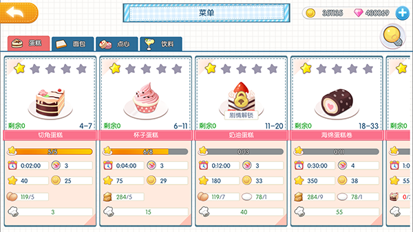 玩家需要使用操作台制作及研发甜品,甜品分为4大类,共40种甜品,通过升级、任务等解锁新品,同时料理最高可以提升到5星级,升星会增加各种属性;制作甜品需要消耗相应食材及店员体力值,研发升级需要消耗体力值 。
