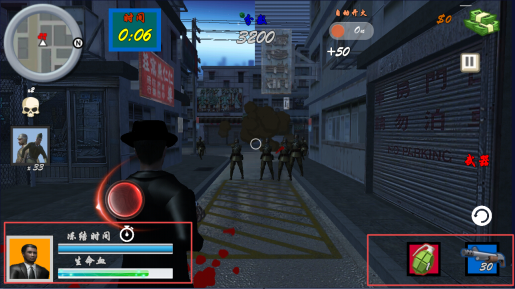 左下角是你的血条,生命值到底就会死亡,右下角则可以切换武器,有毛色冲锋枪和手雷可以选择,后期还有更多武器等待解锁。