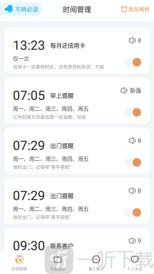 这是一款极为实用的手机闹钟软件。在该软件里,你能依据自身需求进行设置,还能更有效地管理个人时间。可以这么讲,拥有这款软件,你不但能养成良好的生活习惯,还能按时落实个人的各项安排。