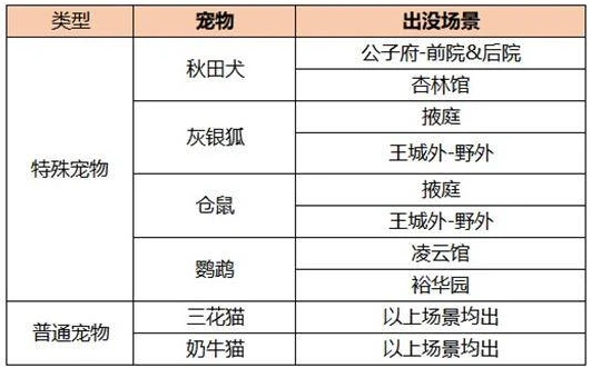 1、宠物出没场景:①特殊宠物:秋田犬:公子府前院和后院、杏林馆,灰银狐:掖庭、王城外野外,仓鼠:掖庭、王城外野外,鹦鹉:凌云馆、裕华园。