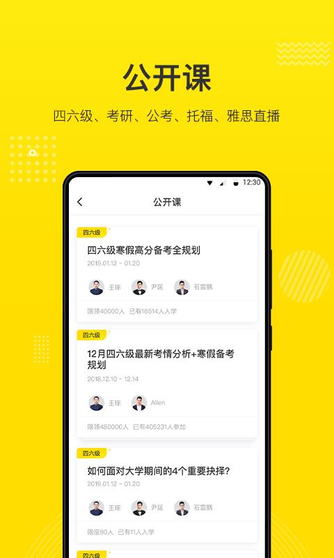 4. 点击“公开课”,即可通过直播学习多种类型的课程。