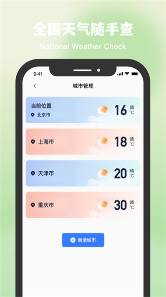 2. 涵盖全国各地的天气预报,支持同时添加多个城市进行管理,让查看与了解天气更为便捷,还能添加自定义小组件。