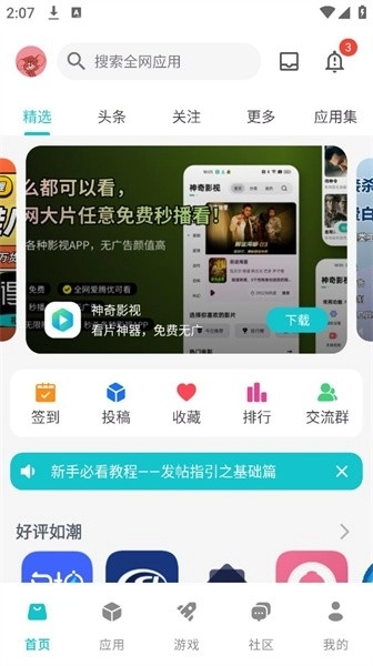 神奇应用免费手机版,这可是一款专门提供软件与游戏资源的第三方应用商店。它设有应用、游戏以及社区等板块,其中社区里有话题、热门内容,还有实用软件、技术交流、游戏交流和资源分享等丰富类别。这里的游戏与应用分类极为细致,涵盖了其他知名应用商店所没有的精品游戏与应用软件,像影视视频、音频音乐、小说漫画、工具、玩机软件等应有尽有。游戏方面更是精选多样,包括休闲、跑酷、塔防、动作、音游等。而且还有应用游戏排行榜供大家参考。有需要的朋友可千万别错过啦!