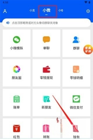 1、第一步,打开刷圈兔。这里以生成微信对话为例,毕竟这是极为常见的使用场景。接着点击箭头指向的微微聊天,随后您便会踏入奇妙的编辑世界!