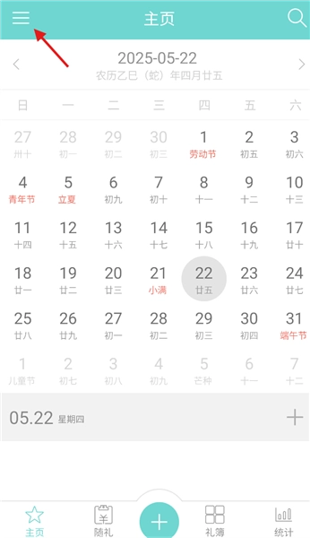 1、打开人情笔记进入主页,轻触左上角扩展符号,唤出隐藏功能选项。