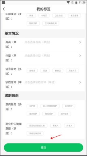 3、在我的标签界面里有很多信息需要填写,像专业能力,基本情况和求职意向等,最后提交就评价好了。