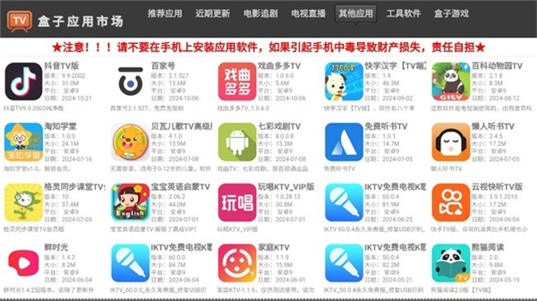 盒子应用市场 TV 版,堪称功能超强的软件资源平台,专为智能电视量身打造。用户在此平台,既能搜索到各类实用工具,又能找到各种游戏,轻松让电视拥有如同手机般丰富的功能。不仅如此,还能在线观看直播节目,尽情享受音乐 k 歌等娱乐体验,全方位满足你的任何需求。喜爱的朋友,赶紧来盒子应用市场 TV 版体验一番吧!