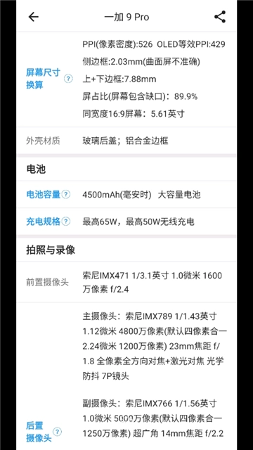 2. 在更新后的页面上,用户能够随意点击进入某一款手机的介绍页面,接着向下滑动屏幕,就能够看到这款手机的外观属性、电池、拍照与录像等相关参数。
