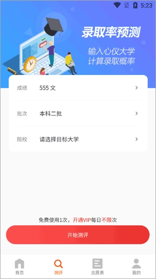 5、点击测评,输入心仪大学,计算录取率概率。