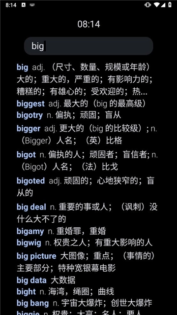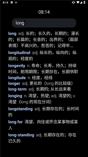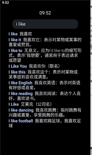 2、在搜索框内输入单词名称,系统将实时自动进行翻译,为你呈现不同语言场景下的使用规范。