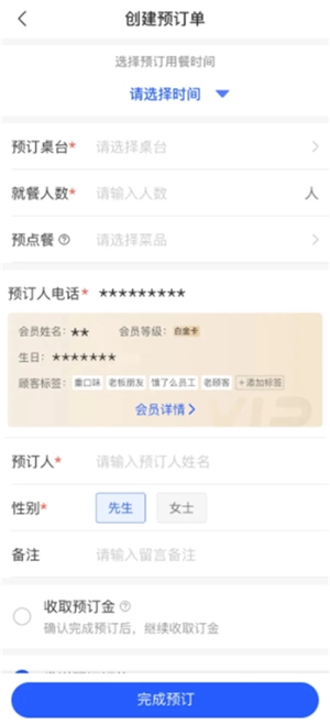 3、会员来电时可切换创建预订页,会员识别后可展示基础会员信息,最终完成预定工作。