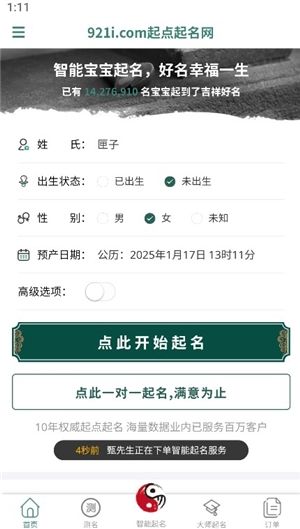 2、首页就是智能起名,用户输入姓氏、出生状态、性别、出生日期等,就能一键取名