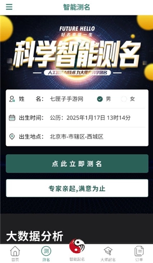 4、测名和取名类似,只需输入姓名、性别、出生日期及地点,点击“立即测名”便可。
