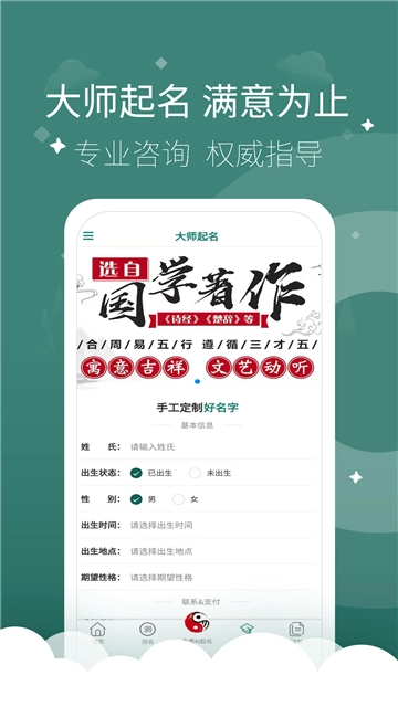 1、用户除了可以让系统自动生成名字,还能够请大师帮忙取名。