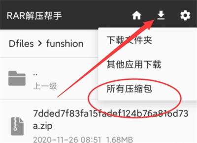1. 轻点屏幕右上方的图标,接着在弹出选项中选取“所有压缩包”。