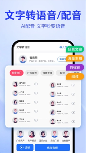 刺鸟配音拥有超200种丰富音色,任用户随心挑选,全方位契合各类场景的配音要求。用户能便捷地对语速、语调和音量进行调节,打造独具个性的语音效果。同时,还配备一系列实用工具,像文案提取、智能改写以及多人配音等。