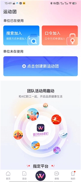 2、进入运动团后,里面提供单位正在使用以及尚未使用的相关内容。