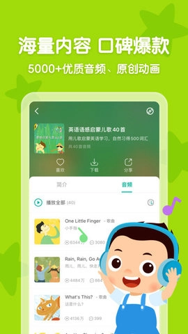 3、绘本儿歌资源:提供优美曲风的儿歌,由专业播音员录制,给孩子提供优质的听觉体验。