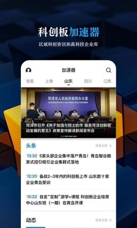 5、【加速器】:此页面依据全国不同地区进行分类,展示出众多头条动态,涵盖政策之声、最新报道、科创新秀、人物专访等内容。