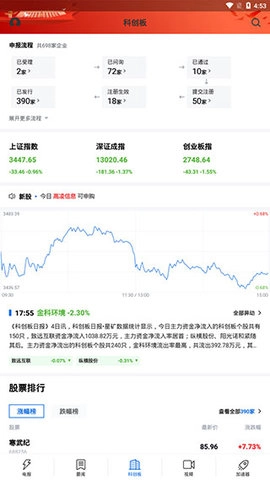 3、【科创板】:该页面显示的是申报流程、上证指数、深证成指、创业板指等内容,下方还有新股信息和股票排行情况。