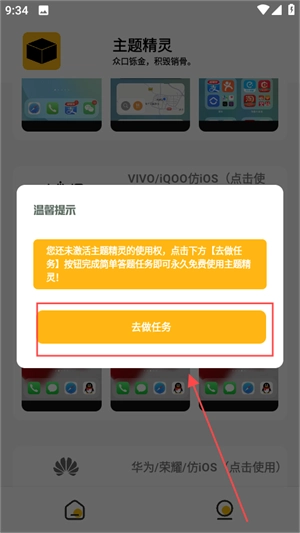 4、点击使用后,页面将显示未激活主题精灵的使用权,此时需去完成任务。