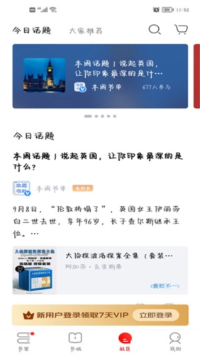 7、进入社区,有很多用户在这里分享书籍和阅读心得以及大家推荐书籍等。