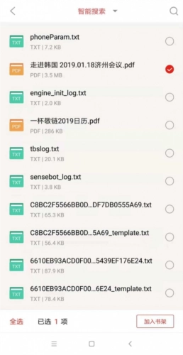 5.自动进入智能搜索界面,手机会自动检索设备内所有符合播放格式的文件,epub、pdf、TXT。但要先把文件通过网盘或者数据线上传到手机设备中。选择上传的书籍,点击右下角“加入书架”。