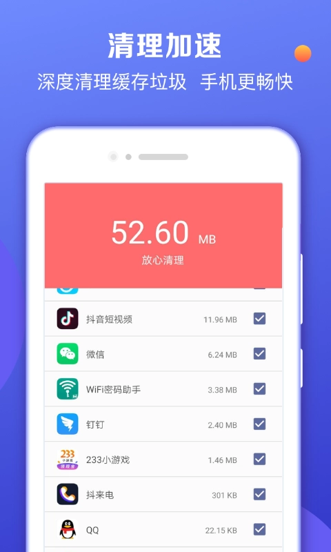 深度清扫手机垃圾,全方位清除各类内存缓存垃圾!实现更深度、更安心的手机清理!运用智能算法精准匹配进程清理方案,仅需1秒,快速恢复手机流畅运行速度。