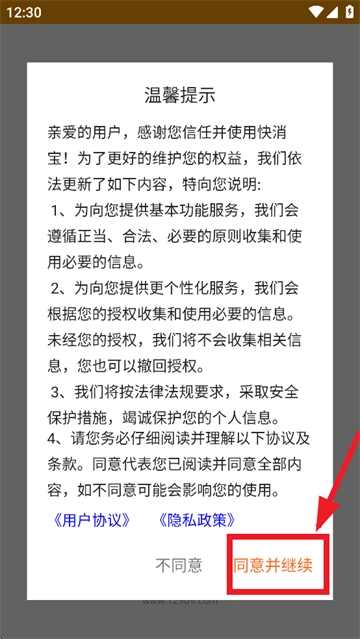 在本站完成安装后打开快消宝,首先需同意并继续温馨提示。