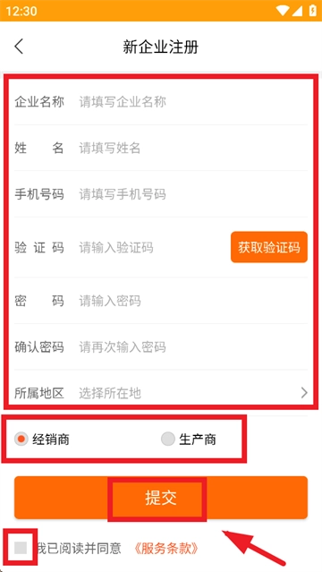 按照要求填写相关信息,从经销商与生产商中做出选择,勾选“我已阅读并同意 《服务条款》”,随后点击提交就完成操作了。