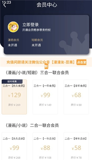 4、此处设有小说、漫画、短剧这三种vip会员机制,你可挑选适合自身的进行付款购买。