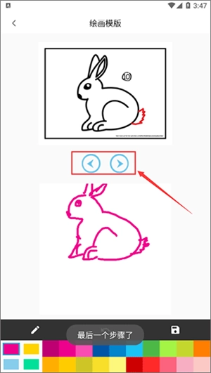3、上方的画板展示的是绘画教程,点击画板下方的按钮,能够切换前后步骤。下方的画板,大家可依照步骤展开创作。