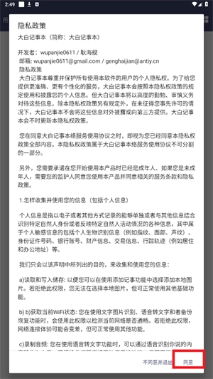1. 开启大白记事本,点击同意隐私协议。