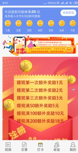 1成功登录后,点击“视频”频道或者“文章”频道,把任意一篇文章或者一个视频转发到微信,阅读之后会有现金奖励。