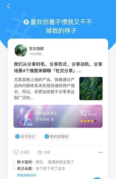1、在这款软件里,形形色色富有文化素养的人会分享自己对书籍的独到见解,还会彼此推荐心仪的好书。