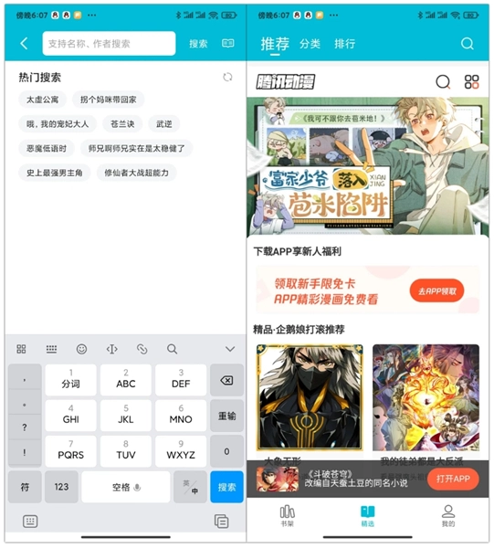 追读漫画,我们可以通过搜索框搜索名称,也可以通过App自带的推荐榜或分类追读。