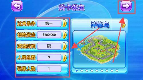 2、在关卡设置中选定初始资金、游戏时长和人物总数后,点击右上角的箭头按钮进入下一步操作。